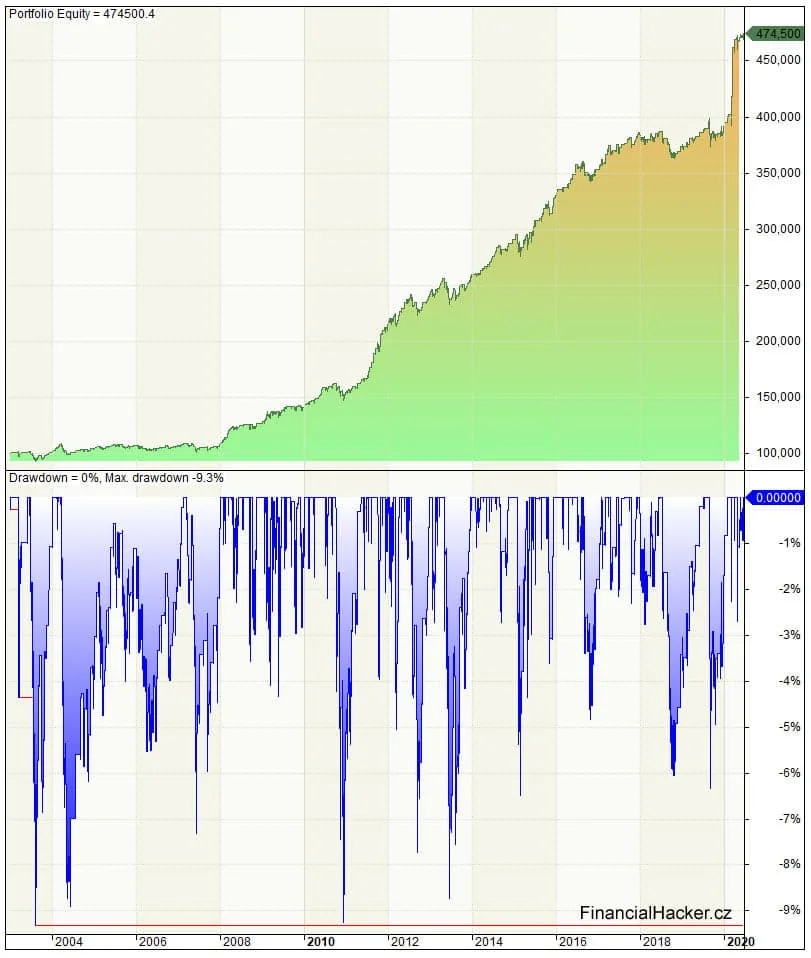 Systém záměrně ukazuji s pákou 1:1, protože už je zde vyšší expozice kapitálu (exposure) oproti prvnímu, tudíž i vyšší riziko. Průměrná délka držení je 3,1 dne. Níže ještě srovnání průběhu equity a drawdownu systému se strategií nakup a drž.