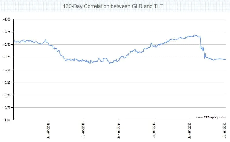 ETF fond TLT je, oproti indexu S&P 500, pozitivně korelovaný s ETFkem na zlato (GLD), ale pořád poměrně málo (průměr za poslední tři roky je nějakých +0,30 %).