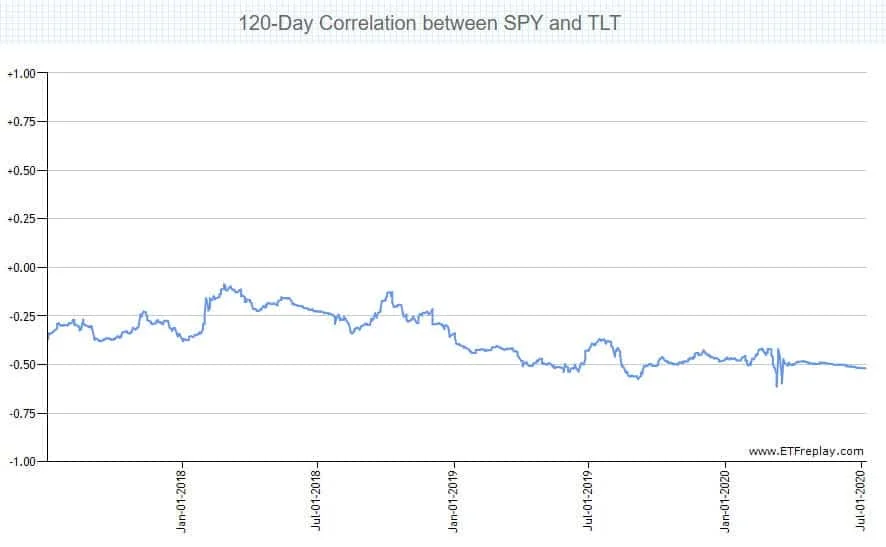 Korelace s indexem S&P 500 je spíše inverzní, poslední rok více. Graf níže znázorňuje průběh korelace se zlatem.