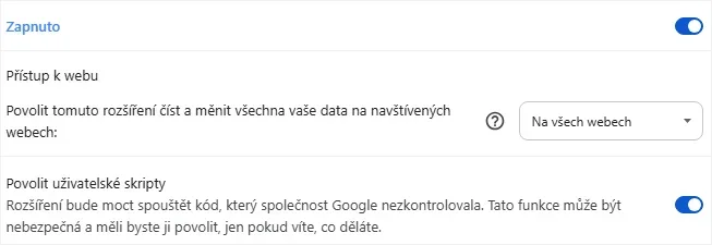 @grant), běží tedy v omezeném režimu. - Nenačítá žádný externí kód (