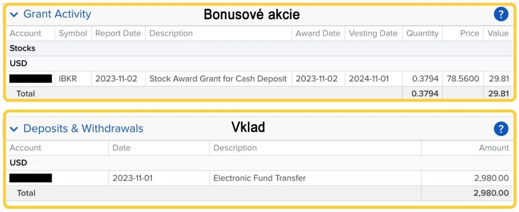 V ukázce na screenshotu došlo 1.11.2023 k připsání vkladu na účet IB (electronic fund transfer), následující den 2.11.2023 (award day) byly připsány bonusové akcie, v tomto případě frakce 0,3794 ks. Akcie byly blokovány do 1.11.2024 (vesting day).