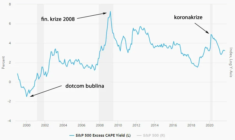 Jenomže původní Shillerův model má jednu nedokonalost – nebere v potaz úrokové sazby (např. v roce 2000 se úrokové sazby pohybovaly mezi 5,5 až 6,5 %, dnes jsou 0 %). A protože je Robert Shiller opravdu ekonomická kapacita (držitel Nobelovy ceny), přišel s upgradovaným ukazatelem nazvaným Excess CAPE Yield (ECY), který se počítá jako inverzní hodnota CAPE odečtená od reálného výnosu amerických desetiletých vládních dluhopisů. Čím je ECY vyšší, tím jsou akcie atraktivnější a naopak.