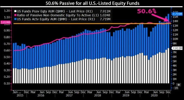 Je vidět, že pasivně řízené fondy v USA (držící jak domácí tak i zahraniční aktiva) měly koncem roku 2020 nepatrně vyšší podíl vůči aktivně řízeným (konkrétně 50,6 %), to však samo o sobě ještě neznamená, že nedochází k efektivní distribuci peněz. Proč? Protože bude vždycky existovat obrovské množství aktivních investorů, kteří by této tržní neefektivity využili k nákupu podhodnocených aktiv a jednoduše tak dosáhli nadvýkonnosti vůči indexům, čímž by bezpochyby došlo k výraznému odlivu peněz investorů z pasivních do aktivních fondů. Ale to se podle všeho neděje – co je mně známo, tak indexové pasivní fondy hravě překonávají v delším horizontu většinu aktivně spravovaných fondů.