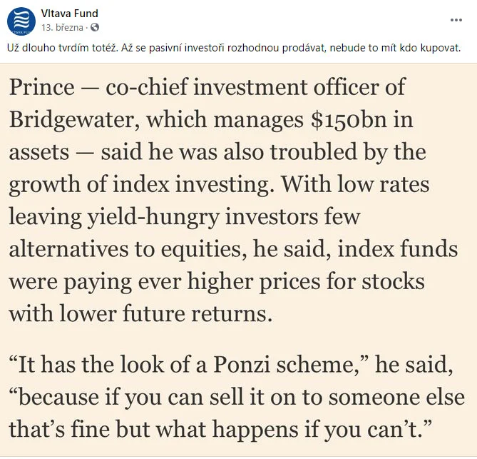 Dan Gladiš tvrdí totéž co Bob Prince z fondu Bridgewater, tedy že pasivní investování do indexových fondů (ETFs) má charakter Ponziho schématu a jakmile se indexový investoři rozhodnou prodávat, nebudou mít komu. Tohle je poměrně silné tvrzení nepodložené žádnými fakty. Já jej zkusím rozklíčovat a naopak fakty podpořit.