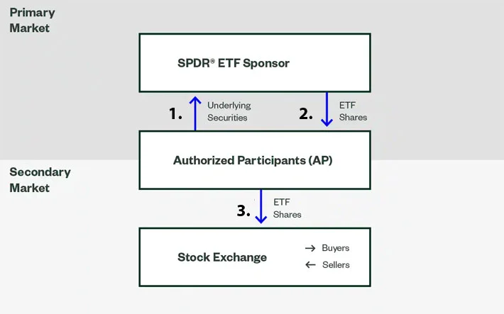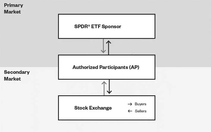 Obchodování ETFs probíhá současně na dvou trzích – primárním a sekundárním. Na primárním trhu operují dva subjekty – sponzor daného ETFka (např. BlackRock, iShares…) a tzv. authorized participant (AP) neboli oprávněný účastník, což je označení pro brokery s vlastním zúčtování, kteří regulují nabídku ETF akcií na sekundárním trhu. Na sekundárním trhu spolu obchoduje AP a burza, na které následně nakupují a prodávají ETFka všichni ostatní. AP je tedy mostem mezi primárním a sekundárním trhem, neboli prostředníkem mezi burzou a správcem daného ETF.