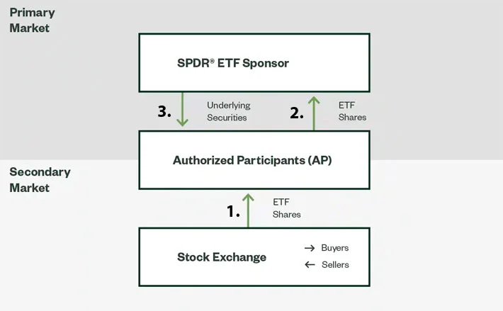 - Tyto nově vytvořené ETF akcie jsou poté AP uvedeny na sekundární trh, kde s nimi obchodují nakupující a prodávající prostřednictvím burzy.