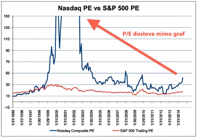 Jak si představuji bublinu já? Třeba v podobě nesmyslných P/E hodnot indexu Nasdaq v letech 1999 až 2003… (aktuálně kolem 35)
