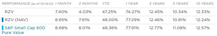 S většinou se asi shodneme na tom, že likvidita je u ETFek obrovská, nicméně někteří mohou argumentovat (a obvykle argumentují) tím, že problém může nastat u small a micro-cap společností, jenž mají nízký denní turnover (počet zobchodovaných akcií * cena) a tudíž by díky masivním výprodejům pasivních investorů totálně zdecimovaly jejich valuace, protože by neexistovalo dostatek kupujících (protistrana), kteří by byli ochotni v daný okamžik vůbec nakoupit. Na tento problém ETF instrumenty myslí a mají ho poměrně elegantně vyřešení skrze tzv. sampling. Jedná se o strategii, kdy fond nakoupí pouze dostatečně likvidní tituly v takovém mixu, aby byla korelace s podkladovým indexem co nejvyšší. Vzorkování obvykle využívají ETFka kopírující světové indexy (MSCI World) nebo rozvíjející trhy (MSCI Emerging Markets). Jako příklad může sloužit třeba ETF s tickerem $RZV (Invesco S&P SmallCap 600 Pure Value), který trackuje celkem 600 společností, ale fyzicky drží pouze 165 akcií.