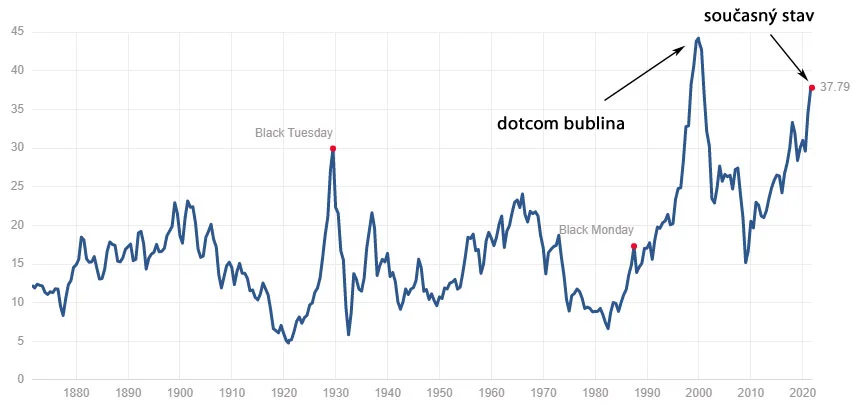 Spousta ekonomů a finančníků poukazuje na vysoké Shillerovo CAPE ratio, které vyjadřuje poměr ceny k zisku upravený o desetiletou inflaci a sezónní faktory. Graf vypadá děsivě…