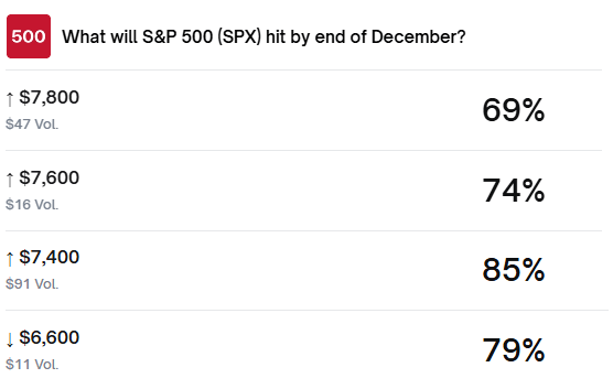 Níže ještě pro zajímavost pravděpodobnosti, jak vidí konec roku 2026 na SPX sázkaři na Polymarketu…