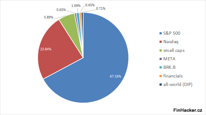 - Vyšší koncentrace do technologií – cca 24 % portfolia držím v technologických firmách přes ETF na Nasdaq