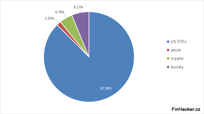 Ve srovnání s předchozím rokem došlo k nárůstu podílu v kryptu (18 % BTC, 82 % ETH) z 1 % na 5 % na úkor ETF složky. Nechtěl jsem si zvyšovat páku, takže jsem nepatrně odprodal S&P 500.