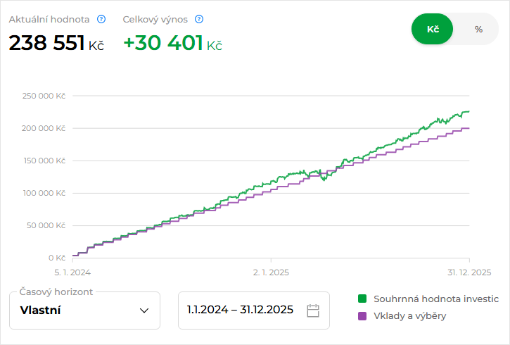 - Měnový hedging – vzhledem k expozici do USA se částečně zajišťuji proti měnovému riziku, aktuálně držím zhruba 20 % v korunách a zbytek v dolarech, tohle se v minulém roce vyplatilo