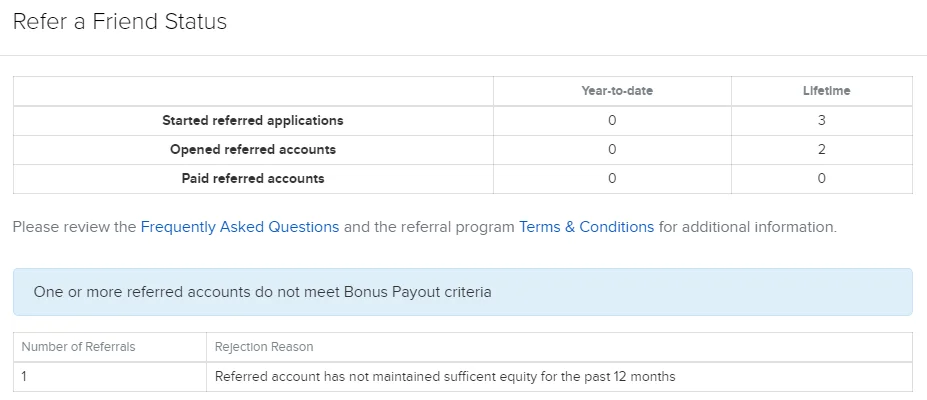 Z celkem tří evidovaných doporučení dokončili registraci reálného účtu pouze dva klienti a z toho jeden nesplnil podmínku alespoň 10 000 USD NAV po dobu jednoho roku. Proto se IB nikdy neumístí v hodnocení na top pozicích u účelově založených webů typu Finex, Investplus a dalších pochybných affil stránek a blogů. Tam je pořadí určeno pouze dle výše vyplácené provize a jednoduchosti jejího dosažení.