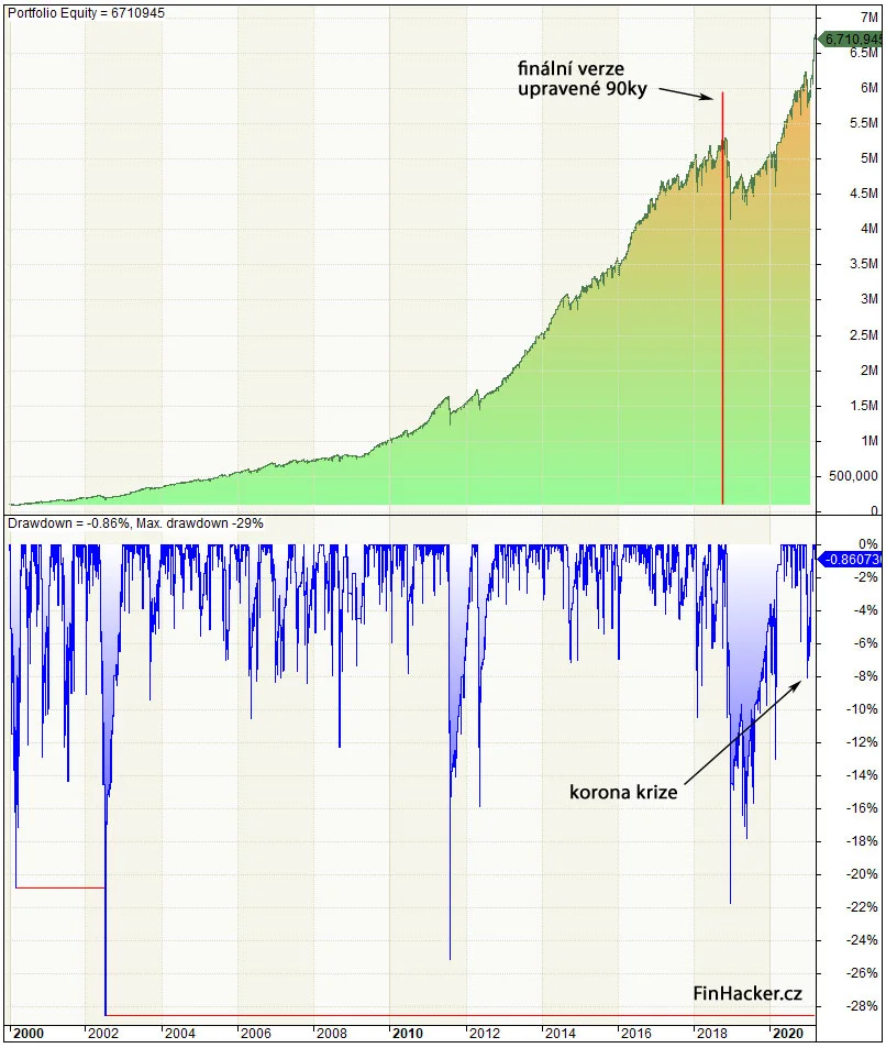 Na první pohled je vidět, že nová verze devadesátky je mnohem méně volatilní, což je zřetelné například na maximálním drawdownu během tohoto období (-21,61 % vs -44,12 %). Pokud jde vše podle plánu a trhy rostou, bude původní strategie na koni. Čas od času ale vše podle plánu nejde a to je potom člověk rád za jakýkoliv méně agresivní přístup, který lze finančně a psychicky přežít bez větší újmy.