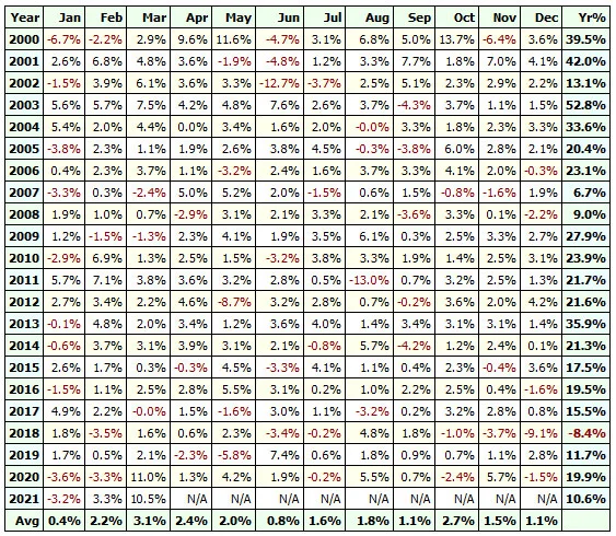Za povšimnutí stojí poměrně stabilní equity křivka, která překonává svoje high, ale zejména průběh drawdownu v čase. Jeho maximální hodnota byla za posledních víc jak dvacet let -28,55 % (-54 % u S&P 100), při nedávné korona krizi to bylo pouhých -8 % (-31,44 % u S&P 100). A to prosím nezapomínejte, že se strategie obchoduje na páku 2:1 (v případě maximální expozice kapitálu)!