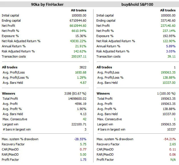 Srovnání jednotlivých ukazatelů vůči buy & hold přístupu je pozoruhodné (pozn.: v rámci backtestu 90ky není zohledněné zdanění zisků z obchodování). Za povšimnutí stojí zejména: